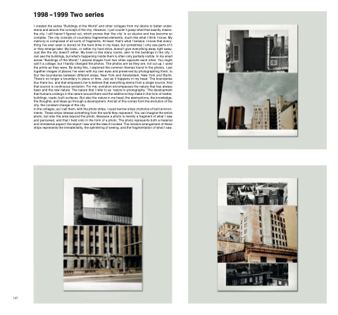 I created the series “Buildings of the World” and other collages from my desire to better under- stand and absorb the concept of the city. However, I just couldn’t grasp what that exactly means: the city. I still haven’t figured out, which proves that ‘the city’ is so elusive and has become so complex. The city consists of countless fragmented elements, much like what I think I know. My memory is composed of all sorts of fragments. At least, that’s what I believe. I know that every- thing I’ve ever seen is stored on the hard drive in my head, but sometimes I only see parts of it or they emerge later. My brain, or rather my hard drive, doesn’t give everything away right away. Just like the city doesn’t either. My brain is like many rooms, akin to the buildings in the city. I can see the buildings, but what’s happening inside them is often only partially visible. In my small series “Buildings of the World,” I placed images from two cities opposite each other. You might call it a collage, but I hardly changed the photos. The photos are as they are, not cut up; I used the prints as they were. By doing this, I explored the common themes found in the photos. I put together images of places I’ve seen with my own eyes and preserved by photographing them, to blur the boundaries between different areas. New York and Amsterdam, New York and Berlin. There’s no longer a boundary in place or time. Just as it happens in my head. The boundaries blur there too, and that empowers me to believe that everything stems from a single source. And that source is continuous evolution. For me, evolution encompasses the nature that has always been and the new nature. The nature that I refer to as ‘nature in photography.’ The development that humans undergo in the nature around them and the additions they make in the form of matter, buildings, roads, built surfaces. But also the nature in my head, the abstractions, the knowledge, the thoughts, and ideas go through a development. And all of this comes from the evolution of the city, the constant change of the city.