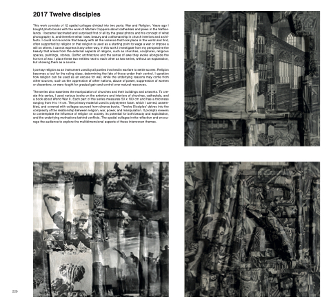 The series also examines the manipulation of churches and their buildings and artworks. To cre- ate this series, I used various books on the exteriors and interiors of churches, cathedrals, and a book about World War II. Each part of the series measures 50 x 100 cm and has a thickness ranging from 9 to 14 cm. The primary material used is polystyrene foam, which I carved, assem- bled, and covered with collages sourced from diverse books. ‘Twelve Disciples’ delves into the complexity of the relationship between religion, war, power, and manipulation. It prompts viewers to contemplate the influence of religion on society, its potential for both beauty and exploitation, and the underlying motivations behind conflicts. The spatial collages invite reflection and encou- rage the audience to explore the multidimensional aspects of these interwoven themes.