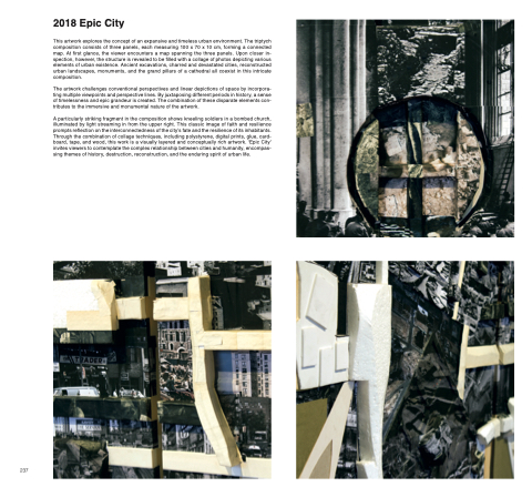 A particularly striking fragment in the composition shows kneeling soldiers in a bombed church, illuminated by light streaming in from the upper right. This classic image of faith and resilience prompts reflection on the interconnectedness of the city’s fate and the resilience of its inhabitants. Through the combination of collage techniques, including polystyrene, digital prints, glue, card- board, tape, and wood, this work is a visually layered and conceptually rich artwork. ‘Epic City’ invites viewers to contemplate the complex relationship between cities and humanity, encompas- sing themes of history, destruction, reconstruction, and the enduring spirit of urban life.