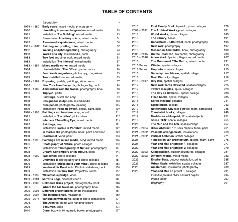 First Family Book, leparello, photo collages 179 The Archival Works, photo collages 181 World Works, photo collages 185 The Library, books 191 Canalstreet - 34th Street, book, photography 195 New York, photography 197 Mensen in Amsterdam, book, photography 199 On the Road Too, two books, photography 203 A new start: Spatial collages, mixed media 207 The Monument / The Matrix, mixed media 211 Citadel, spatial collages 213 Unphoto, spatial collages 215 Secretay Lunchbreak, spatial collage 217 Meat District, collages 219 City War, spatial collages 221 New York Yards Revisited, spatial collages 225 Twelve disciples, spatial collages 229 The City as Cathedral, spatial collage 233 Filled books, spatial collages 235 Series Holland, collages 241 Stapelingen, collages 243 Netherlands City (self-portrait), foam, cardboard 245 Translated books, collages 249 Models for a blueprint, 12 spatial objects 251 Series ‘TEN’, spatial collages 255 The Nun and the Arts, spatial collage 257 Black Abstract, 101 back objects, foam, paint 261 Possible arrangements, installations 269 Vertical Ambition, spatial collages 271 4 modellen van architectuur, objects, foam, paint 275 Year-end Mail art project 1, collages 277 Year-end Mail art project 2, collages 279 Kijktoestellen, outdoor sculptures, collages 281 Different works, mixed media 283 Empire State, outdoor installation, prints 285 Urban Oasis, exhibition, spatial collages 287 Amsterdam, installation, photography 289 Year-end Mail art project 3, collages 291 Possible preface Black abstract project 294 Image index 297 Biography 301